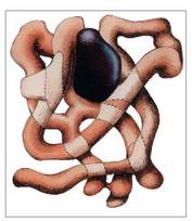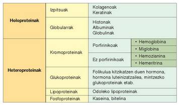 + Mioglobina. Hemoglobinaren oso antzekoa da: batetik, betetzen duen funtzioagatik (oxigenoaren garraioa) eta, bestetik, hemoglobulinak duen hemo taldearen berdina duelako. Hala ere, katea txiki bakar batez osatutako proteina da (153 aminoazido) (18. irudia).+ Glukoproteinak. Glukoproteinaren