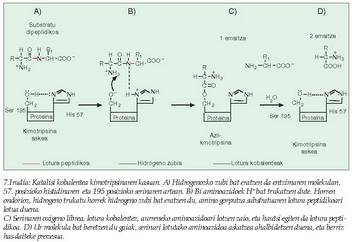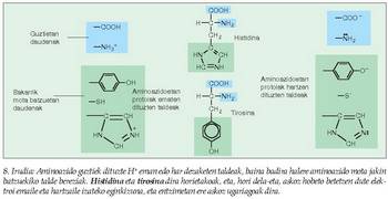 (Zineman, azidoz beteriko bainuontzi batean sartuz desagertarazten dituzte hiltzaileek beren biktimen gorpuak). Entzima batzuk ordea, kimotripsina adibidez, pH neutroko lotura horiek hausteko gai dira, hautsibeharreko loturaren gertueneko ingurua oso azidoa bihur dezaketelako. Hipotesi horren lagungarri, esan behar da badela aminoazido mota jakin bat askoz eragin handiagoa izan dezakeena azido-base jokoan, eta aminoazido hori askoz ere sarriagoa izaten da entzimetan beste proteina motetan baino (8. irudia).