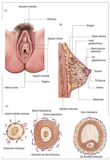 hauek dira: bi obulutegi eta sexu alderdietako bideak (Fallopioren hodiak, umetokia eta