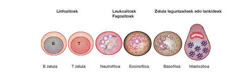 parte har dezaketen fagozitoak, eta B eta T linfozitoak, erantzun bereziaren eragile direnak. B