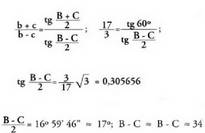 eta beste bi angeluen balioak.Ebazpena :Datuak : b = 10 cm c = 7 cm A = 60 ° ; Baldin eta A = 60° bada, orduan, B + C = 120 ° Tangentearen teorema erabiltzean, hau ateratzen da :