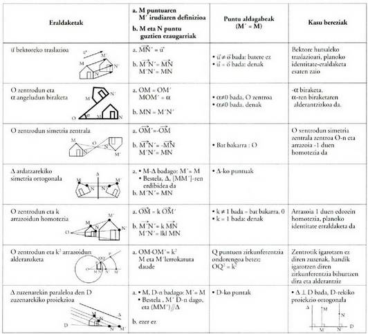 Traslazioak, biraketak, simetriak, hormoteziak, alderanzketak eta proiekzioak