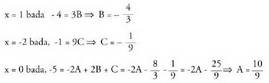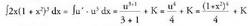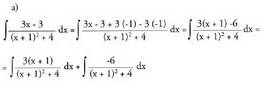 Berriro ere,erako integralak berehalakoak dira.? Adibidea1. Kalkula ezazuEbazpidea:Zenbakitzailearen maila (2), izendatzailearena (3) baino txikiagoa denez, ez da polinomio arteko zatiketarik egin behar.polinomioaren erroak Ruffiniren erregela erabiliz lortzen dira :Polinomioak erro sinple bat, -2, eta erro anizkoitz (bikoitz) bat, 1, du.Emandako zatikia honela deskonposatzen da zatiki sinpletan :Lehengo kasuan bezalaxe, zenbakitzaileak berdindu egiten dira, eta A, B eta C zehazteko, x-ri balio arbitrarioak ematen zaizkio.BerazC) Erro irudikariak ateratzen direnean.Koefiziente errealak dituen polinomio baten erro irudikaribat badu, bere konjokatuaere, polinomioaren erro da.etaarteko biderkaketa egiten bada, hau lortzen da:(i zenbaki irudikiariakegiaztatzen du).
