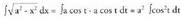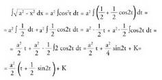 Integral hau bi arrazoirengatik azaltzen dugu hemen ; alde batetik, aldagai-aldaketa baten bidez ebazten delako, eta, bestetik, hurrengo gaian ikusiko diren eta integral mugatuaren bidez kalkulatzen diren azalera eta bolumenen kalkulutan sarri azaltzen delako.a konstante bat izanik,erako integralak ebazteko,aldagai aldaketa egiten da.Diferentziala eginez,Horrela,Beraz,Trigonometrian ikusten denez hau betetzen da :Bi berdintzak atalez atal batuz,Beraz,Honen ondoriozsin 2t = 2 sin t.cos t dela gogoan izanik,Bainada, orduan, etadenez,Bestalde,denez,izango da.Azkenik, hona iristen da :? Adibidea1. Kalkula ezazuEbazpidea :Aldagai aldaketa :Bainadenez,Aldaketa deseginez :