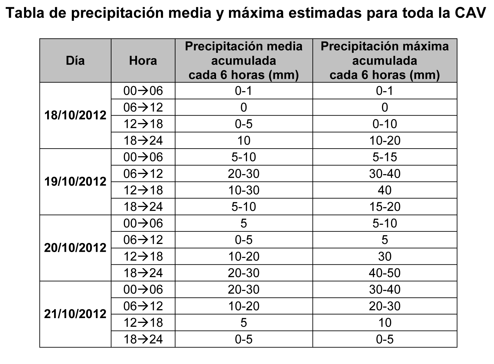Los pronósticos de Euskalmet indican que los acumulados de lluvia previstos podrían ser importantes entre el jueves 18 y viernes 19, en torno a 40-60 l/m2 en general, con valores que podrían situarse por encima de los 60 l/m2 localmente en la vertiente cantábrica y por encima de los 80 l/m2 en algunos puntos del este de la vertiente cantábrica (Gipuzkoa). Además, la intensidad de las precipitaciones podría llegar a ser fuerte en algunos momentos con posibilidad de superar los 15 l/m2 en una hora.