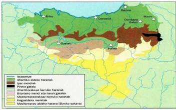 Euskal Herriko landare paisajeak garbi erakusten du lurralde honen ezaugarria den ingurune gradienteen aniztasuna, bai eta goian aipatu ditugun errekurrentzia eta sinkope fenomenoak ere. Hortik dator, esaterako, erabat alde atlantikoan eta guztiz alde mediterraniarrari dagozkien landare komunitateak behin eta berriro azaltzea, aurrerakadaz eta atzerakadaz betea den esparru batean. Molda dezagun ingurune desberdinen araberako eskualdez eskualdeko zirriborro labur bat, horien ezaugarri ohargarrienak agertuz. Haritz kandudunen (Quercus robur) hariztiaren eremua, itxuraz, zalantzarik gabe, ia sustratu mota guztietan barreiaturik dago, bai itsasbazterreko eskualdean eta bai Atlantiko alderako haranetako muinoetako lurzoru guztian. Horretarik kanpo geratuko lirateke mendiko lurzoru urrian eta klima zein edafologia arrazoi bereziek landare egitura berezietarako bide ematen duten guneetan agertzen diren pago multzoak. Kantauri aldeko artearen (Quercus ilex) eremua, paisajearen aldetik oso deigarria dena, barnealdeko zenbait toki babestutan aurki daiteke, baina Bizkaiko eta Gipuzkoako mendebaleko kostaldea da haren esparru nagusia. Gutxi gizenduriko lurzoruetan aurkitu ohi da, harritsu eta bereziki lehorrak direnetan, gehienbat kareharrien gainean, bai eta, gutxiagotan, silizeoetan ere, non kostaldeko zenbait gunetan artelatza (Quercus suber) ere agertzen den. Ameztiaren (Quercus pyrenaica) eremuak, bere aldetik, askoz ere lurralde hedadura murritzagoa hartzen du. Hareharrizko mendi hegal eta gailurretan aurki daiteke, drenaje errazeko lurzoruetan eta, atmosfera argi eta lehorreko alderdietan hobe hazten bada ere, kostaldeko zenbait gunetara ere iristen da. Gutxi asko pinu gorriak (Pinus sylvestris) lagundurik agertu ohi den erkameztiaren (Quercus faginea) eremuak margazko zenbait haran hartzen ditu Bizkaiaren eta Burgosen arreko mugan, Atlantiko aldeko gainerako haranetan baino izotzaldi zein lehorraldi luzeagoz eta argitasun handiagoz hornitua den alderdian. - Atlantiko-Mediterraneo banalerroko mendiak ez dira inoiz 1.600 metroz gorago altxatzen; horregatik, euri ugariz eta tenperatura freskoz hornitua den mendiko lurzoru bioklimatikoan aurkitzen gara bete-bete-an: pagadiaren (Fagus sylvatica) eremua da.