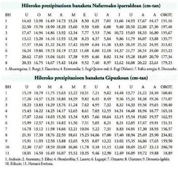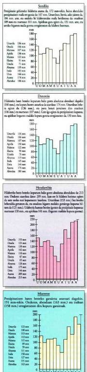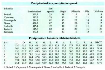 Uriarteren arabera (1982), 1961-1980 bitartean 14 aldiz izan ziren 100 baino prezipitazio ordu gehiago (lau aldiz apirilean eta beste lau azaroan), eta 24 aldiz 20 mm-tik beherako prezipitazioak: 6 uztailean, 2ekainean eta 2 abuztuan (0 azaroan, abenduan, apirilean eta maiatzean).