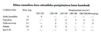 Prezipitazio gehien izaten duen lurraldea Gipuzkoa da. Mutriku eta Getaria arteko kostaldean eta Ordizia-Beasaingo sakonuneko gune batzuetan jasotzen dira balio apaienak: ez dira urteko 1.000- 1.200 mm baina garaiagoak izaten, oro har. Plubiometria maila "apal" horren eragileak gune horietako ezaugarri bereziak dira.