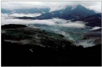 b.- Euskal Herriko mendikate nagusien topografia egitura bitxia. Euskal Herriko mendilerroek arku bat osatzen dute, Iparraldean ahurgunea duen arku bat; aire masa hezeei eta ekialdeko jarioari sarbidea galarazten die arku horrek. Orografiak eragin handia du kliman; klimari zenbait xehetasun ematen dizkio eta klima mota bakoitzari dagokion espazioa zedarritzen du.