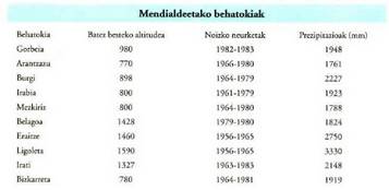 Dena dela, Euskal Herriko mendialdeetako ezaugarri termo-plubiometrikoen tasunak erakutsiko dizkiguten zenbait dacu badira. Oro har, prezipitazioak oso ugariak dira, eta lotura estua atzematen da behacokiak dauden garaieraren eta prezipitazioen bolumen orokorraren artean, nahiz eta orientazioak eta kokalekuak ere zerikusi handia duten urteko kopuru orokorretan.Pirinioetako gailur garaiak alde batera utzita, Euskal Herriko mendietan 1800- 1900 mm prezipitazio jasotzen dira urtean.Uriartek dioenez (1977), prezipitazioei buruzko datu aipagarrienak Ekaitza mendikoak {1.034 m) dira: 2.500 mm/m 2 -ko kopurua gainditzen da han. Baina hori baino balio garaiagoak dituzte Eraitzen eta Ligoletan (2.750 eta 3.330 mm, hurrenez hurren).Mendialdeen altitudea eta aire jario eta masa nagusiekiko kokalekua dira horretan eragin gehien duten ezaugarriak, izan ere, aire masa hezeek hegoalderantz egiten dutenean oztopo orograñkoekin -oro har, ekialde-raendebaJ orientaziokoak- topo egiten dute, gora egin behar izaten dute oztopoak gainditzeko eta horren ondorioz prezipttazio handiak sortzen dira.Baina, haia ere, bereizketa bat egin beharra dago Euskal Herriko mendebalaren eta ekialdearen artean eta Pirinioetako hegoaldeko eta iparraldeko isuraideen artean.