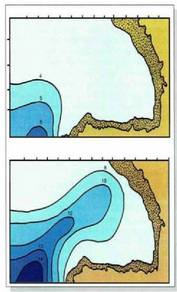 Neguan, berriz, fosfato kontzentrazio maila berdina izaten dute ur azalak eta itsas hondoak, eguraldi zakarrak azaleko eta sakoneko ur geruzak nahasten baititu. Ur gaineko fosfato maila handiena neguan izaten da (otsailean), udaberrian hala ere maila hori igo egiten da itsasertzetik hurbil dauden uretan.