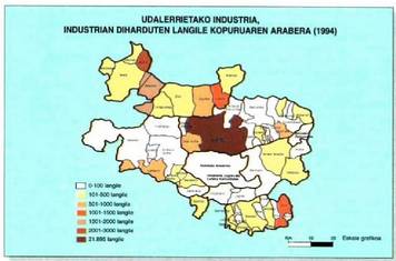Udalerriz udalerri aztertuta, eta mapan ikus daitekeen bezala, hiriburuko industria enplegua Arabako gainerako udalerrietakoa baino askoz handiagoa da. Gasteizek 22.000 bat enplegu ditu, eta industria gehien duten gainerako udalerriek -Laudio, Amurrio, Oion eta Legutiok-, aldiz, 1.000-3.000 baino ez.