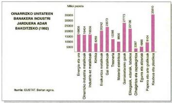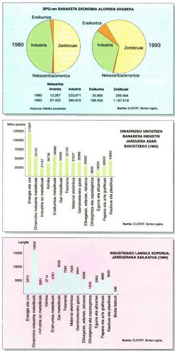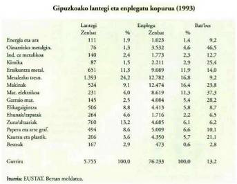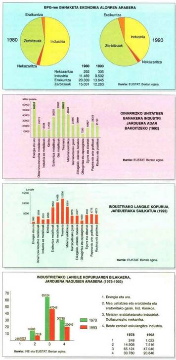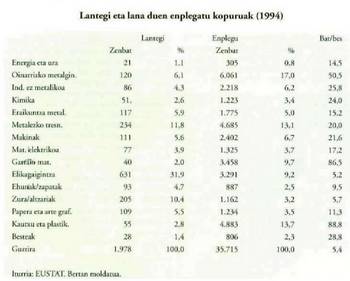 1978.urtean bederatzi enplegatuz gorako lantegi bakoitzeko 83,4 enplegu bazeuden, 1993an 49,8 baino ez. Industria enpleguak 1978-1994 bitarteko urteetan jarduera talde handien arabera zer bilakabidea izan duen ikusteko, jo dagokion grafikora.