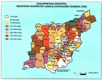 Enplegu/lantegien batez bestekoak gora egin du, 1978-an 21,5 zen eta laurogeita hamarreko hamarraldian 48raino igo zen; lantegiak handitu egin direla adierazten du horrek, baina datu hori ez da zehatza, bost enplegatu baino gutxiago duten laurogeita hamar lantegi estatistika horretan jasoak ez daudelako.Lantegi/enplegua erlazioari dagokionez, laurogeita hamarreko hamarraldian lantegien %12,5ek 5etik 9 enplegatu bitarte zituzten eta industriako enpleguaren %1,8 biltzen zuten; %70,9k 10etik 49ra enplegatu zituzten eta enpleguaren %28,3 biltzen zuten; %7,9k 50etik 99ra enplegatu zituzten eta enpleguaren %11,5 biltzen zuten; %7,3k 100etik 499ra enplegatu zituzten eta enpleguaren %32,1 biltzen zuten; eta % 1,4 lantegi besterik ez ziren 500 enplegatutik gora zituztenak, industria enplegu guztiaren %23,6 biltzen zutela. Enpresa txikia da beraz nagusi eta sektore horretan daude lanposturik gehienak.