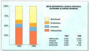 1990ean barne produktu gordina 261.848 milioi pezetakoa izan zen, Nafarroako ekonomia guztiaren %34,1, alegia, eta alboko taulan ikus daiteke ekonomia arloka nola banatua eta sailkatua dagoen.