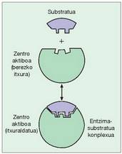 Entzima jakin batek bere substratua ?ezagutu? dezan, bi baldintza bete behar dira: egiturazko ezaugarriren bat, finkapen zentroarekiko lotura bidera dadin, eta lotura kimiko bat, zentro katalizatzailearen jardunaz hautsi behar dena (5. irudia). Nolakoak diren bata eta bestea, hala eragingo dio entzimak substratu jakin bati ala ez dio eragingo.5. Irudia: A) Kimotripsinaren substratua, xehetasunez ageri direla entzimak ?ezagututako? egitura eta eragiten duen lotura. B) Entzimaren substratu posibleak: denek betetzen dituzte bi baldintzak.<br><br>Erreakzioak katalizatzerakoan, ez dute lastertasun berberez jokatzen entzima guztiek eta, horren ondorioz, badirudi faktorebatzuek zerikusia dutela entzima jakin batek erreakzio bat katalizatzean duen eraginkortasunean.