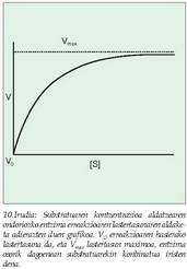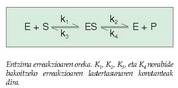 Erreakzioen lastertasunen azterketaz arduratzen den kimikaren adarra da zinetika; hortaz, entzimek parte hartzen duten erreakzioen lastertasuna aztertzen du entzima zinetikak.Substratuaren kontzentrazioaren araberakoa da entzima erreakzioaren lastertasuna, alegia, substratu erabilgarria duen neurrianhazten da, harik eta, konplexu aktibo moduan, entzima osoa substratuaren molekulekin konbinaturik dagoen unea iristen den arte. Une horretan lastertasuna apaltzen da, ez baita beste erreakziorik izango entzimaren molekularen bat aske geratu eta beste substratu batekin konbinatzeko gai ez den arte. Orduan entzimaren kontzentrazio jakin baterako lastertasun maximoa lortu dela esaten da (10. irudia); erreakzio lastertasunaren kurban lastertasun iraunkor moduan ageri da, grafikoan lerro zuzen gisa adierazten dena.L Michaelisek eta M. Mentenek, arazoari irtenbidea emateko, entzima erreakzioa orekazkoa zela proposatu zuten (11. irudia).