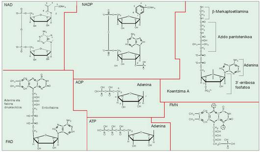 Koentzima arruntenak elektroi eramaileak dira; aipagarrienak hauek dira: nikotin-adenin-nukleotidoa (NAD) eta haren forma fosforilatua (NADP), flabin-mononukleotidoa (FMN) eta flabin-adenin-dinukleotidoa (FAD). A koentzima (CoA) da beste koentzima oso garrantzitsua, azilo taldeen transferentzian erabiltzen dena. Horiez gainera, aipatu beharrekoak dira adenin-trifosfato (ATP) eta adenosin-difosfato (ADP) energia eramaileak (12. irudia).