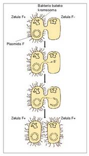 Ia bakterio mota guztiek badituzte, bakterio kromosomaz gainera, DNA molekula osagarri askoz txikiagoak, plasmido esaten zaienak. Plasmido horiek kromosomari erants dakizkioke, orduan episoma esaten zaiela. Plasmidoak, bakterio kromosoma bezalaxe, zirkulu formakoak dira, eta beren burua bikoizteko ahalmena dute. Escherichia coli-n dozena bat plasmido deskribatu izan dira, plasmido F edo F faktorea dela garrantzitsuenetako bat horien artean.F faktoreak 25 bat gene ditu, eta horietako askori pili izeneko ileak sortzea dagokie.
