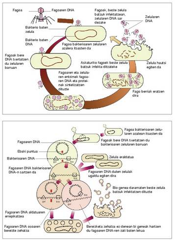 Bakterioak kutsatzen dituzten birusei bakteriofago edo fago esaten zaie. Bakteriofago jakin batzuek –bakteriofago motelduak esaten zaie–, bakterioak kutsatzen dituztenean bi gauza gerta daitezke: fagoak zelularen baliabideak ustiatzea, bikoizteko, fago berriak sortzeko, eta, azkenik, bakterioa suntsitzeko (ziklo litikoa); edo birusaren DNA bakterioaren kromosomari profago gisa eranstea, eta harekin batera bikoiztea eta zelula alabetara igarotzea (ziklo lisogenikoa).