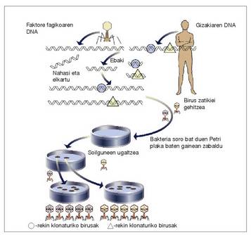- Genea bektore egoki batean txertatzea (plasmido batean edo birus batean). Bektore horiek erabilgarriak behar dute izan, eta ezaugarriren bat izan behar dute, hala txertodun bektorea bereganatu duten zelulak eta bereganatu ez dutenak (adibidez, antibiotikoei erresistentzia egiten dieten geneak) belaunaldi berrian elkarrengandik bereizi ahal izan daitezen.- Banako berkonbinagaiak klonatzea eta bakartzea.