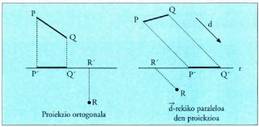 P puntuak r zuzenean duen proiekzio ortogonala deitzen zaio (orokorki d norabide jakin batekiko paraleloa den proiekzioa) P-tik igaro eta eta r zuzenari buruz zuta den zuzenak (d norabideko zuzenak orokorki) r zuzenarekin duen