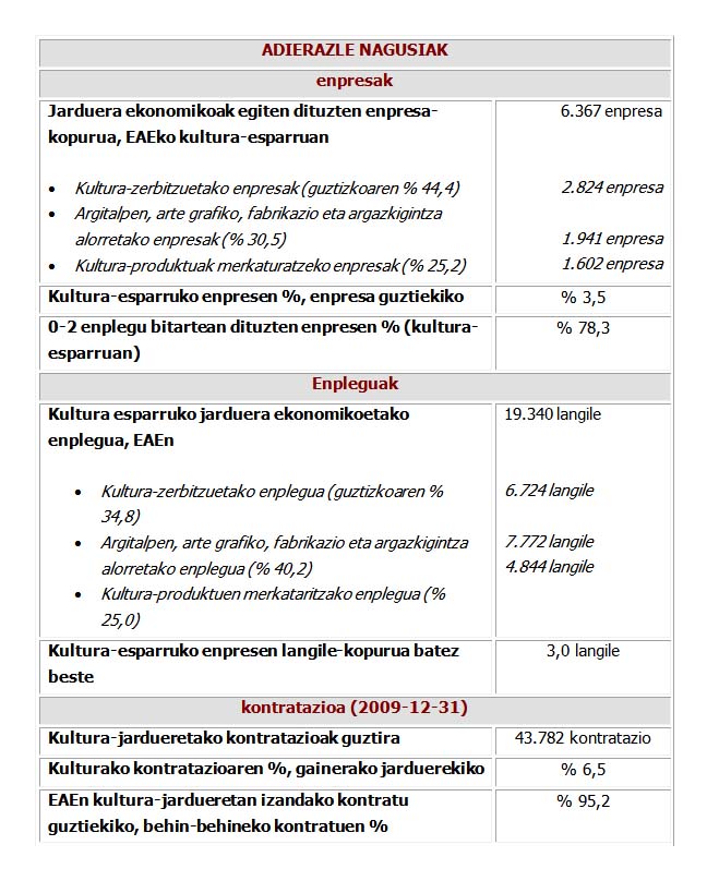 Enpresak : Azterketan kultura-esparruko jarduera ekonomikoek duten pisu nabarmena antzematen da: 2008an 6.295 enpresa zeuden, batez ere Bizkaian eta Gipuzkoan. EAEko enpresa guztiekiko, kultura-esparruko jarduerak dituzten enpresak % 3,5 dira.