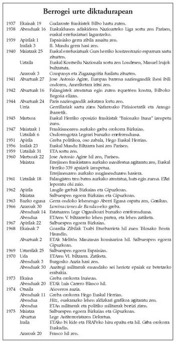 Errejimenaren aurkako mugimenduaren hasiera.1961 Uztailak 18 Falangisten tren baten aurkako atentatua, huts egin zuena. ETAri1962 Apirila Langile grebak Bizkaian eta Gipuzkoan.Maiatza Salbuespen egoera Bizkaian eta Gipuzkoan.1963 Bazko eguna Gerra ondoko lehenengo Aberri Eguna ospatu zen, Gernikan.1966 Azaroak 30 Laminaciones de Bandas-eko greba.Abenduak 14 Estatuaren Lege Organikoari buruzko erreferenduma.Abendua ETAren V. biltzarreko lehen partea, eta lehen zatiketa.1967 Apirilak 22 Salbuespen egoera Bizkaian.1968 Ekainak 7 Goardia Zibilak Txabi Etxebarrieta hil zuen Tolosako Benta Haundin.Abuztuak 2ETAk Melitón Manzanas komisarioa hil. Salbuespen egoera Gipuzkoan.1969 Urtarrilak 25 Salbuespen egoera Espainian.1970 Uda ETAren VI. biltzarra. Zatiketa.Abenduak 3 Burgosko Auzia hasi zen.Abenduak 30Auzitegi militarrak emandako sei heriotz epaiak ez betetzeko erabakia.1973 Ekaina Greba orokorra Iruñean.Abenduak 20 ETAk Luis Carrero Blanco hil.1974 Otsaila Añoveros auzia.Abenduak 11 Greba orokorra Hego Euskal Herrian.Abendua Hitz, euskarazko lehen aldizkari grafikoa argitaratu zen.Abendua ETAn militarrak eta politiko militarrak bereizi ziren.1975 Maiatza Salbuespen egoera Bizkaian eta Gipuzkoan.Abuztua Lege Antiterroristaren Dekretua.Iraila ETAko bi kide eta FRAPeko hiru epaitu eta hil. Greba orokorra Euskadin.Azaroak 20 Franco hil zen.