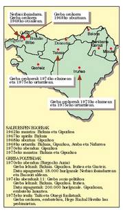 erabakia.1973 Ekaina Greba orokorra Iruñean.Abenduak 20 ETAk Luis Carrero Blanco hil.1974 Otsaila Añoveros auzia.Abenduak 11 Greba orokorra Hego Euskal Herrian.Abendua Hitz, euskarazko lehen aldizkari grafikoa argitaratu zen.Abendua ETAn militarrak eta politiko militarrak bereizi ziren.1975 Maiatza Salbuespen egoera Bizkaian eta Gipuzkoan.Abuztua Lege Antiterroristaren Dekretua.Iraila ETAko bi kide eta FRAPeko hiru epaitu eta hil. Greba orokorra