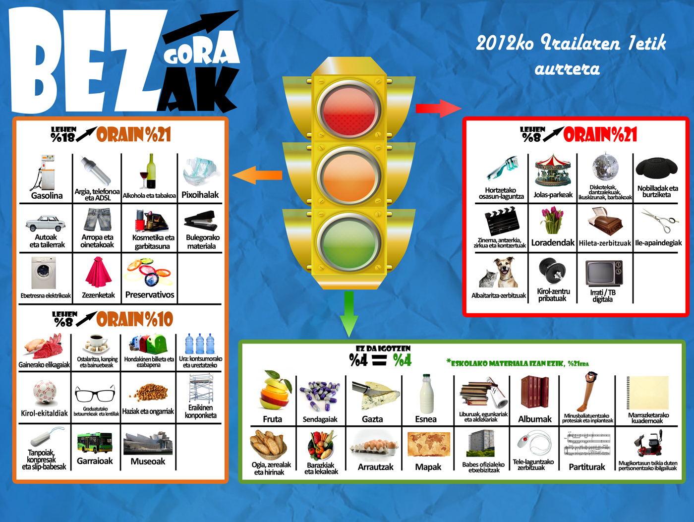 BEZa igo egin da, 2012ko irailaren 1etik. Areagotze horrek kontzumitzaileek maiz erosi edo erabiltzen dituzten hainbat produkturi eta zerbitzuri eragiten die.