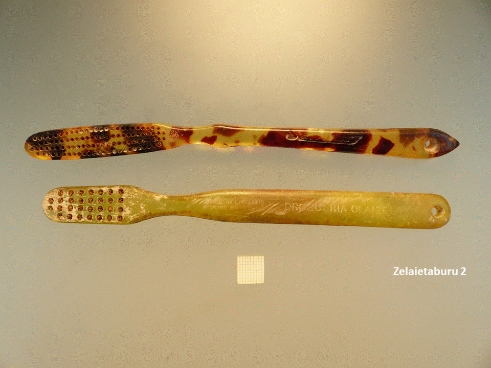 - Zeluloidezko hortzetako eskuila horia. Atzean, fabrikazio-lekua eta kalitatea aipatzen dira: “Made in England. Pure Brush”. Drogeria-denda baten oparia da, bertan iragartzen den bezala: “Droguería Olaizola”.