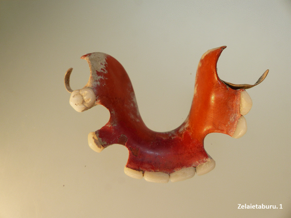 - Zeluloidezko hortzetako eskuila hori eta gardena, jaspeztatuta, gune batzuk marroi koloreko jarrita. Heldulekuaren atzealdean, “Sanitas” marka irakur daiteke.