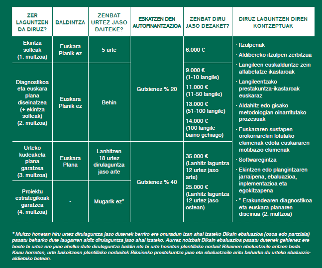 Entitateak diagnostikoa eta euskara plana egingo ditu, entitatearen jardueran euskara pixkanaka txerta dadin. Prozesua gauzatzeko, EMEren araberako entitatearen diagnostiko soziolinguistikoa (ezagutza eta erabilera datuak), eta eraldaketarako euskara plana zehaztuko dira, zerbitzu eta lan hizkuntza kontuan hartuta. Horrez gain, ekintza solteak egiteko aukera izango du entitateak.